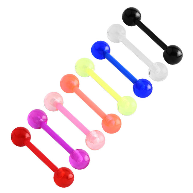 UV Acrylic Barbells come in assorted colours. To be worn in healed piercings. Do Not Autoclave. UV Reactive. For Temporary Wear Only. Specifications: 1.6mm (14ga) x 14mm x 5mm Balls