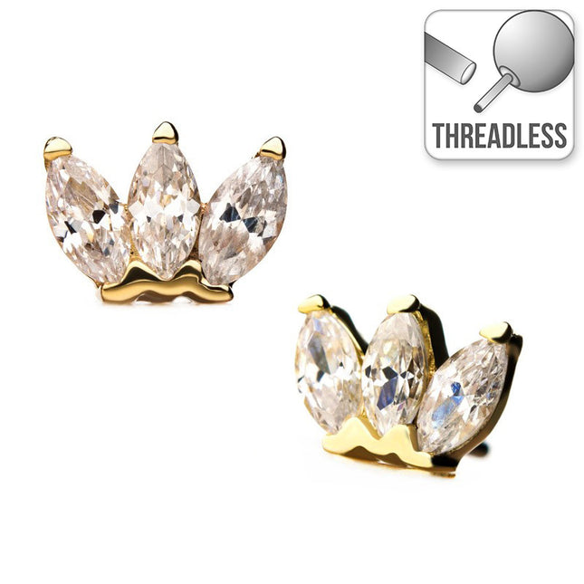 Invictus Threadless 14ct Yellow Gold Small Tri-Bead Attachment. This 14ct gold small tri-bead trinity attachmend is threadless and low profile for a comfortable and attractive piece of piercing jewelry. A perfect dainty piece for anywhere, but looks particularly great in nose and ear piercings! Measures 2.8mm x 2.7mm and is compatible with any Invictus Titanium Threadless Stem.Manufactured from solid 14ct nickel-free Gold with a durable 316LVM ASTM F-138 Implant Grade Steel Pin designed to be practical and easy to use.To fix an attachment to a threadless stem, add a slight bend to the pin by simply inserting the pin half way and gently pushing the attachment to one side. Then push the pin fully inside the stem until the attachment fits securely. To tighten the fit, simply increase the bend of the pin. Start small, and don't bend the pin too far as you risk damaging the attachment.Continuing with our commitment to provide high quality body piercing products, we are proud to introduce our newest line, Invictus Threadless Body Jewellery.The line is made from implant grade titanium TI-6AL-4V ELI ASTM F136 and finished to a bright polish. It consists of barbells, curves, labret bases, balls and genuine Swarovski gem tops which are all completely interchangeable to create a full array of configurations while having to keep less inventory.The thin 25ga pins on our tops allows us to create jewellery starting from 20ga and tops as small as 1.5mm for piercings needing smaller sizes. A range of 14ct Gold tops are also available, with even more styles on offer through custom order.