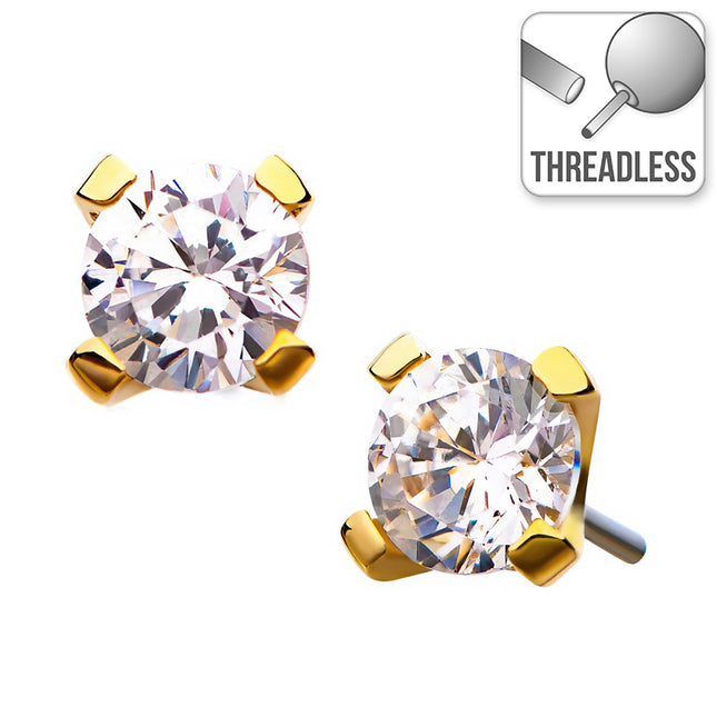 Invictus Threadless 14ct Yellow Gold Prong Set Gem Attachment. Simple and classic, our 14ct gold threadless prong set cubic zirconia top is proof that even the most simple pieces can be absolutely gorgeous. It is available in a 1.5mm, 2mm, 2.5mm, 3mm and 4mm clear cubic zirconia and is compatible with any Invictus Titanium Threadless Stem.Manufactured from solid 14ct nickel-free Gold with a durable 316LVM ASTM F-138 Implant Grade Steel Pin designed to be practical and easy to use.To fix an attachment to a threadless stem, add a slight bend to the pin by simply inserting the pin half way and gently pushing the attachment to one side. Then push the pin fully inside the stem until the attachment fits securely. To tighten the fit, simply increase the bend of the pin. Start small, and don't bend the pin too far as you risk damaging the attachment.Continuing with our commitment to provide high quality body piercing products, we are proud to introduce our newest line, Invictus Threadless Body Jewellery.The line is made from implant grade titanium TI-6AL-4V ELI ASTM F136 and finished to a bright polish. It consists of barbells, curves, labret bases, balls and genuine Swarovski gem tops which are all completely interchangeable to create a full array of configurations while having to keep less inventory.The thin 25ga pins on our tops allows us to create jewellery starting from 20ga and tops as small as 1.5mm for piercings needing smaller sizes. A range of 14ct Gold tops are also available, with even more styles on offer through custom order.
