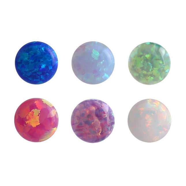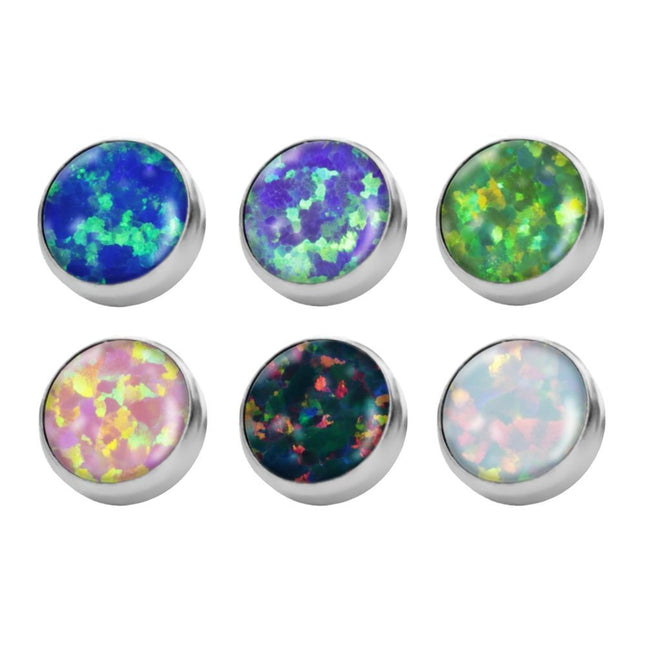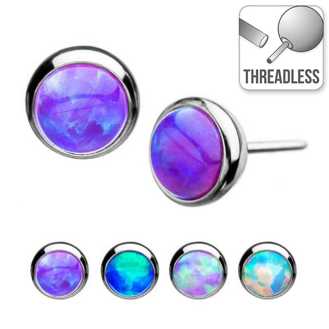Invictus Threadless Titanium Bezel Set Synthetic Opal Attachment.This threadless titanium bezel set synthetic opal attachment comes in a 1.5mm, 2mm, 2.5mm, 3mm, and 4mm Synthetic Opal in various colours and fits into any Invictus Titanium Threadless Stem. Our threadless front-facing top is made from titanium and synthetic opal - and comes in a selection of colors and sizes to ensure it will look great no matter where it is placed.Manufactured from TI6AL4V ELI ASTM F-136 Titanium with a mirror finish polish.To fix an attachment to a threadless stem, add a slight bend to the pin by simply inserting the pin half way and gently pushing the attachment to one side. Then push the pin fully inside the stem until the attachment fits securely. To tighten the fit, simply increase the bend of the pin. Start small, and don't bend the pin too far as you risk damaging the attachment.Continuing with our commitment to provide high quality body piercing products, we are proud to introduce our newest line, Invictus Threadless Body Jewellery.The line is made from implant grade titanium TI-6AL-4V ELI ASTM F136 and finished to a bright polish. It consists of barbells, curves, labret bases, balls and genuine Swarovski gem tops which are all completely interchangeable to create a full array of configurations while having to keep less inventory.The thin 25ga pins on our tops allows us to create jewellery starting from 20ga and tops as small as 1.5mm for piercings needing smaller sizes. A range of 14ct Gold tops are also available, with even more styles on offer through custom order.