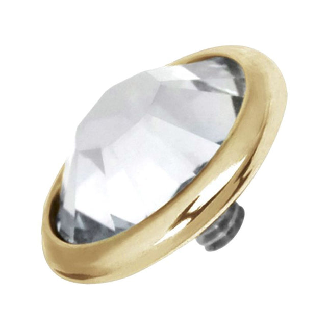 24KT Gold PVD Titanium Threadless Bezel Set Swarovski Crystal Front Facing Tops are made from Implant Grade Titanium TI-6AL-4V ELI ASTM F136 with 25g durable Titanium Pin designed to be practical and easy to use. Fitting all sizes of pins and bases in our threadless body jewelry line. Pin Size: 0.45mm x 4.7mm. Top Size: 3mm x 1.6mm | Gem- 2.5mm