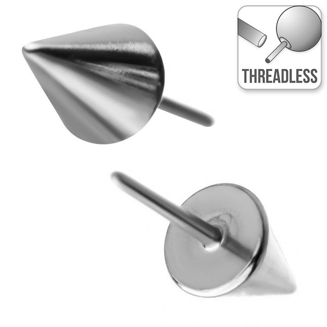 Invictus Threadless Titanium Cone Attachment. This threadless titanium cone attachment measures 3mm x 4mm and fits into any Invictus Titanium Threadless Stem. Punky and funky, this threadless titanium spike cone top is small enough to be subtle, yet still makes a bold statement. Manufactured from TI6AL4V ELI ASTM F-136 Titanium with a mirror finish polish. To fix an attachment to a threadless stem, add a slight bend to the pin by simply inserting the pin half way and gently pushing the attachment to one side. Then push the pin fully inside the stem until the attachment fits securely. To tighten the fit, simply increase the bend of the pin. Start small, and don't bend the pin too far as you risk damaging the attachment. Continuing with our commitment to provide high quality body piercing products, we are proud to introduce our newest line, Invictus Threadless Body Jewellery. The line is made from implant grade titanium TI-6AL-4V ELI ASTM F136 and finished to a bright polish. It consists of barbells, curves, labret bases, balls and genuine Swarovski gem tops which are all completely interchangeable to create a full array of configurations while having to keep less inventory. The thin 25ga pins on our tops allows us to create jewellery starting from 20ga and tops as small as 1.5mm for piercings needing smaller sizes. A range of 14ct Gold tops are also available, with even more styles on offer through custom order.