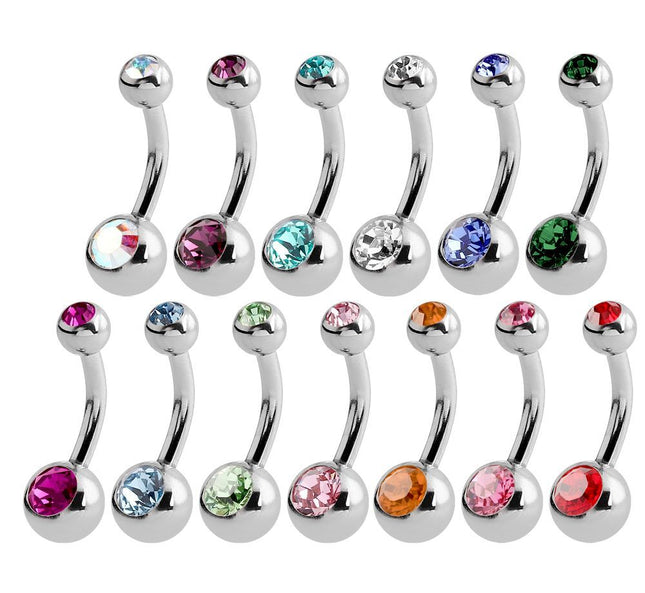Steel Basicline Mini Double Jewelled Bananabells with a 1.6mm (14ga) stem thickness and stem lengths of 6, 8, 10 and 12mm with a 6mm bottom ball and a 4mm top ball.The stones are available in following colours: Crystal AB (AB), Clear Crystal (CC), Blue Zircon (BZ), Dark Blue (DB), Light Blue (LB), Amethyst (AM), Dark Green (DG), Fuchsia (FU), Orange (OR), Light Green (LG), Pink (PK) and Red (RE).