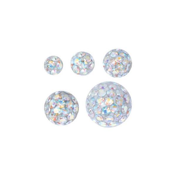 The Steel Basicline Sealed Multi Jewelled Ball features countless premium processed crystals with a protecting epoxy layer resulting in the crystals being sealed and protected.The balls are available with diameters of 3mm and 4mm for 1.2mm (16ga) threads. For thread sizes of 1.6mm (14ga) it is available in 4mm, 5mm, 6mm or 8mm. Choose out of 17 colours: Crystal AB (AB), Amethyst (AM), Blue Zircon (BZ), Fuchsia (FU), Light Blue (LB), Light Green (LG), Light Siam (LS), Orange (OR), Red (RE), Rose (RS), Sapphire Blue (SB), Tanzanite (TA), Yellow (YE), Black Diamond (BD), Jonquil Yellow (JO), Crystal Clear (CC) and Light Amethyst (LA). This product cannot be autoclaved.