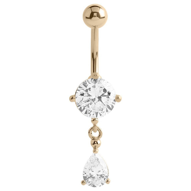 Indulge in luxury. Elevate your style. Make a statement with our 14k Gold Prong Set Teardrop Navel Bar today!