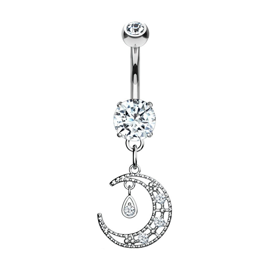 Crescent Moon Micro Jewelled Dangle Plated Fashion Navel in Gold, Silver & Rose Gold