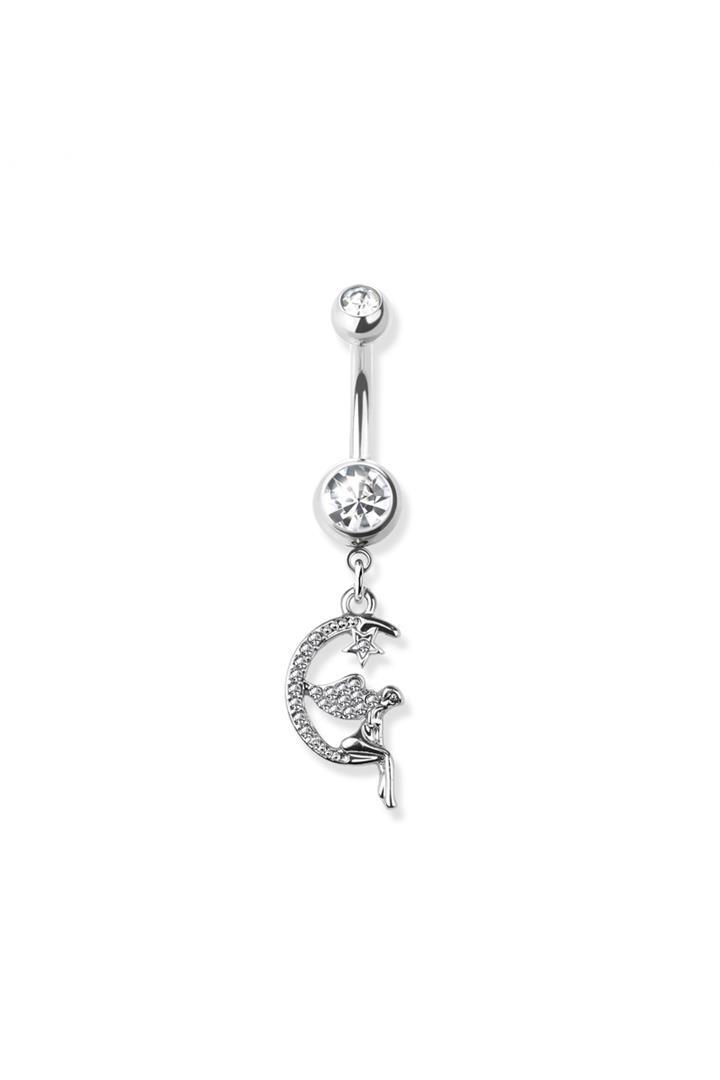 Gem paved angle on crescent moon dangle 316l surgical steel navel ring