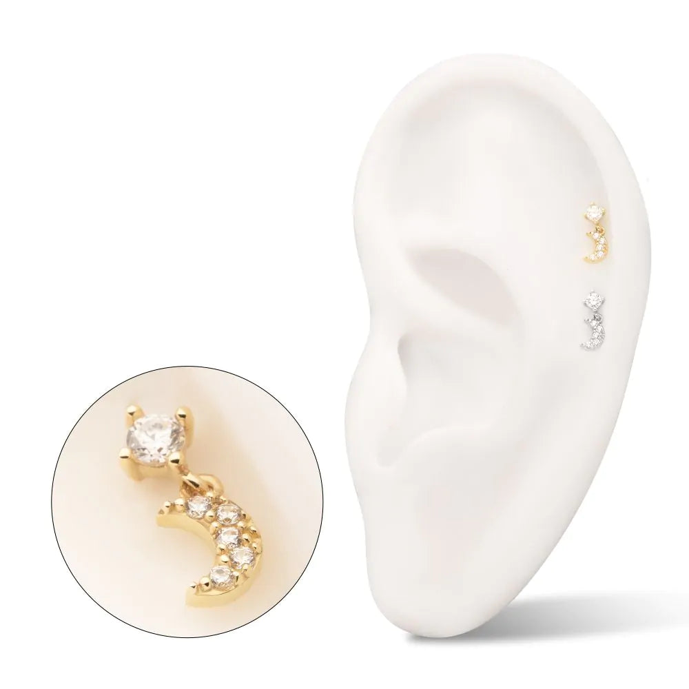 Invictus 14Kt Gold Threadless 4-Prong CZ 2mm Gem Top with Pave CZ Gem Crescent Moon Dangle
