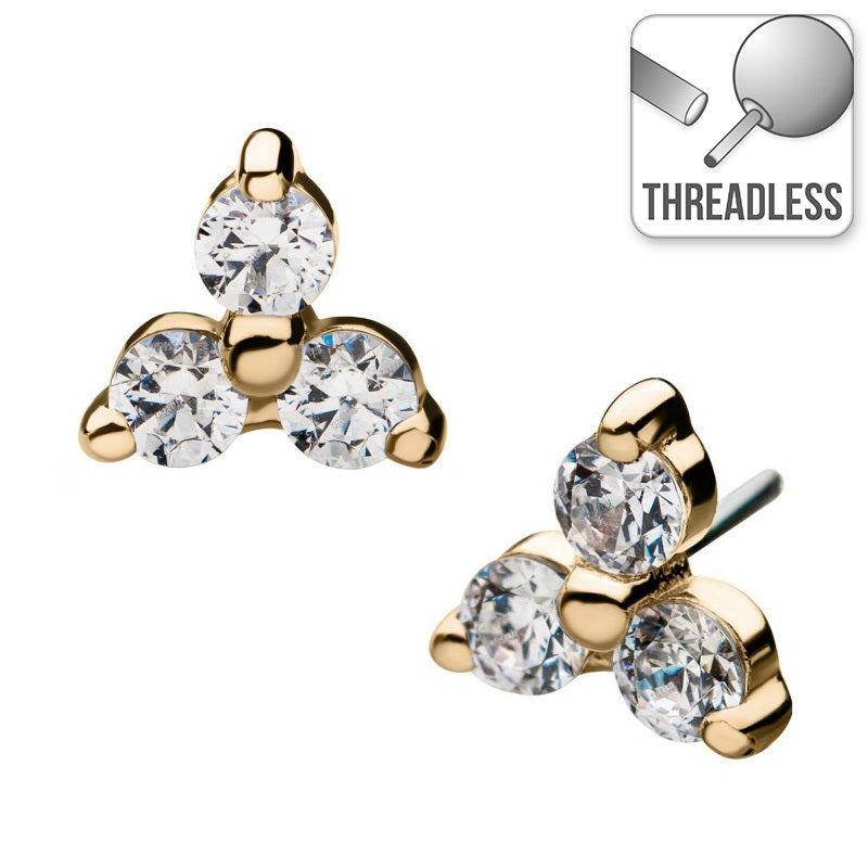 Threadless and made from 14ct gold, our trinity top features a cluster of three 2mm clear cubic zirconia gems held in place with small prongs to suit just about any desired look and style. Add some color and sparkle with this delicate piece that will be a new favorite. Measures 5mm x 5mm and is compatible with any Invictus Titanium Threadless Stem.