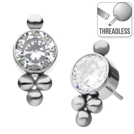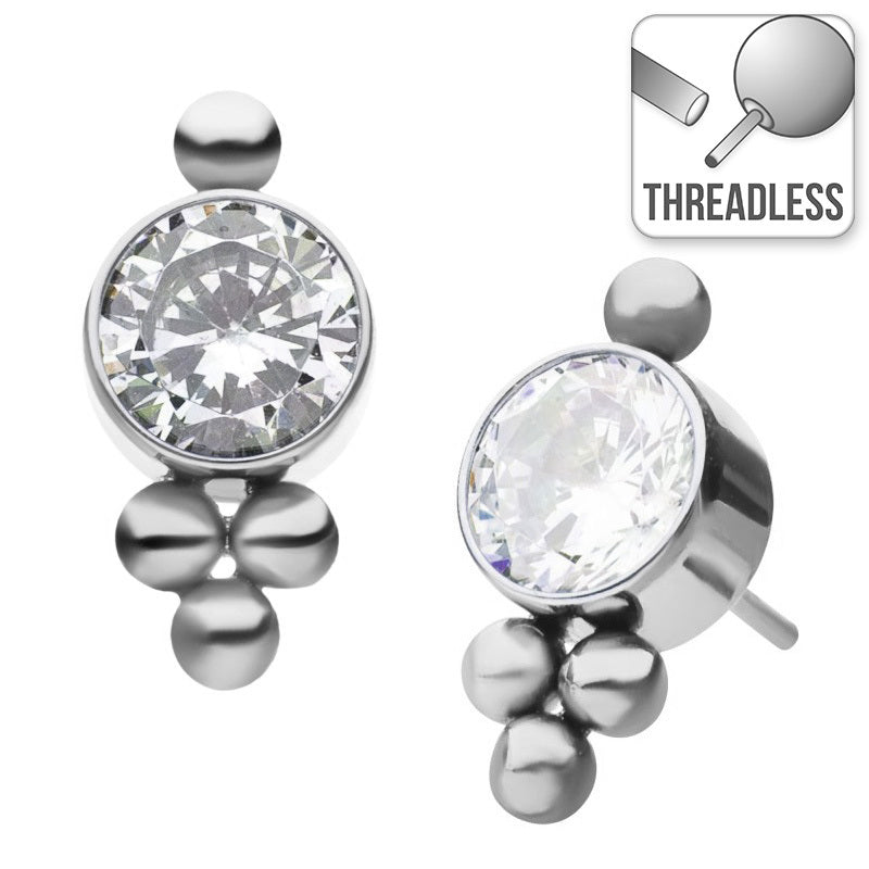 This threadless titanium attachment features a 4mm bezel set clear cubic zirconia, with a single bead at the top and a tri bead cluster at the bottom. This threadless beaded titanium top is a beautiful piece that can be used in many versatile placements for a unique piercing look. Compatible with any Invictus Titanium Threadless Stem.