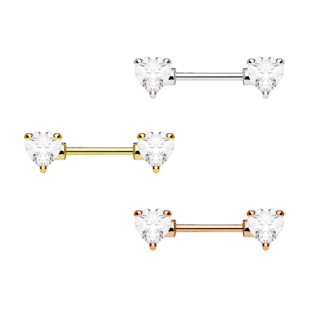 Gorgeous sparkling jewelled hearts adorn this Rose Gold barbell. Claw settings are timeless and the Rose Gold PVD coating is scratch and wear resistant, so you get all the benefits of the Surgical Stainless Steel base but with the lustrous colour of Rose Gold!