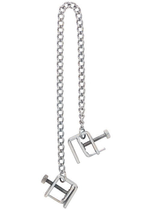Press Style Nipple Clamps with Sturdy link chain, with two box-style adjustable press screw nipple clamps. Top quality build and materials. This pair of nipple clamps is connected by 30cm of heavy weight chain. The 2.2cm long thumbscrews are fine-threaded for precise adjustment of pressure, and will not fall out even when the clamps are fully loosened.